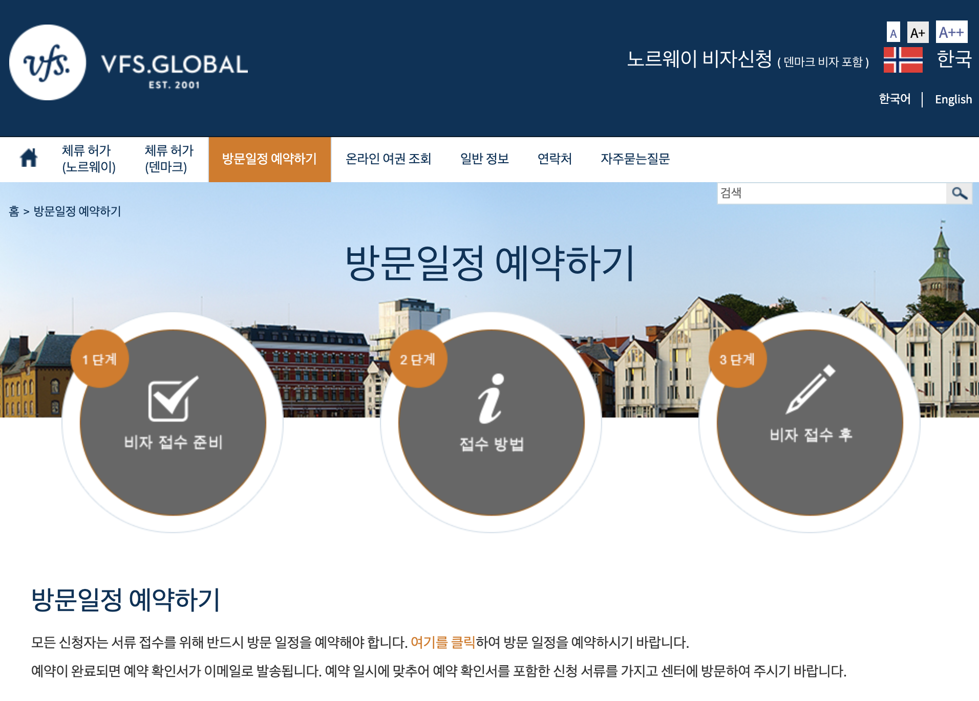 숭례문 바로 옆 단암빌딩에 소재한 노르웨이 비자센터에 방문하여 간단한 면접을 보고 서류를 제출하여야 한다. 방문접수는 반드시 예약을 하여야 하며, 구비해야 할 서류의 가짓수가 꽤 된다. 나아가 현금지불이 요구되므로 현금도 준비하여야 하고, 여권사진 또한 2장 챙겨야 한다. 이하 순서대로 기술한다.
